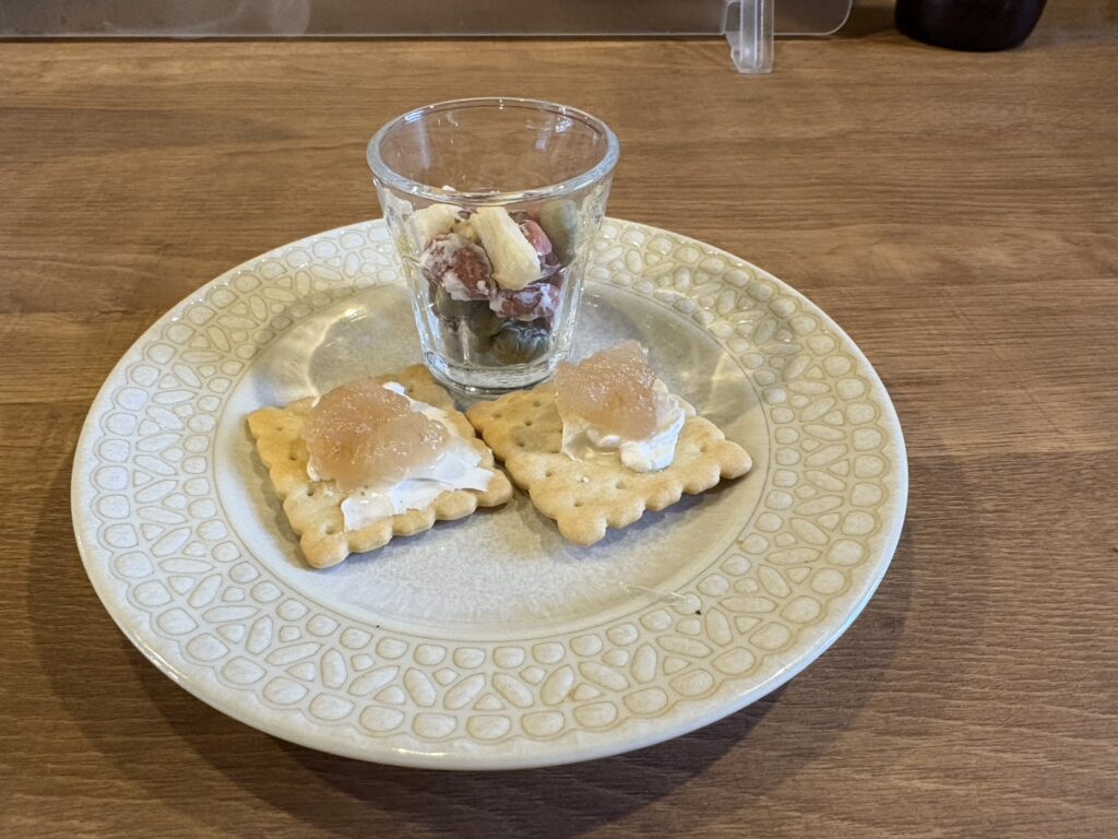 ゴロっと梨ジャムカナッペと大豆、Qナッツ、あられ、ドライパーシモンのミックスナッツ